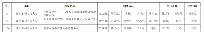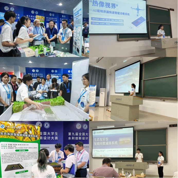 我校选送的三组作品聚焦行业技术难点,注重技术突破,均进入现场决赛。在作品演示、分组答辩、答辩复赛等环节中,参赛选手准备充分、沉着自信,结合实物作品,向专家评委详细介绍了作品的设计思路、创新理念和应用前景,充分展现了新时代水利类大学生的专业素养、协作精神、创新意识及实践能力。最终,作品《“热像视界”—AI驱动堤坝渗漏快速智能诊断系统》获评特等奖,《基于虹吸原理的山塘输水装置及运行方式设计》《生态友好型智能间歇灌排系统》分别获评一等奖,甘建军、黄璟瑜两位老师获得“优秀指导教师奖”。
